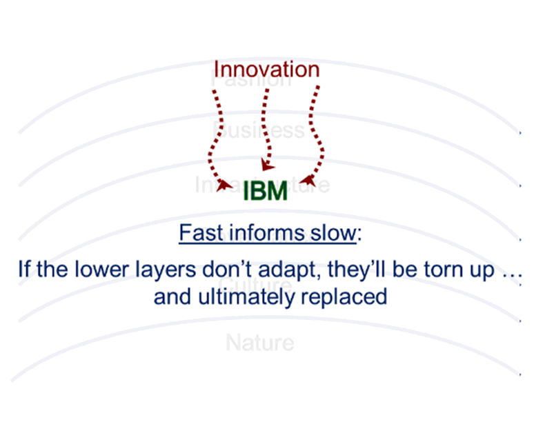 The point: the slow-moving layers (like Infrastructure) have to be adaptive. Otherwise, they’ll be “torn up” by the innovation and change that is taking place in the faster layers.