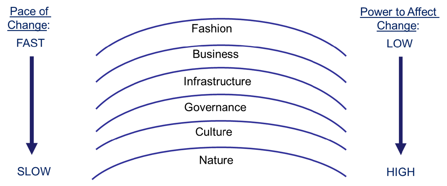 Brand suggests that different “layers” of society change at different pace. From most rapidly changing to slowest moving, the layers are: Fashion, Commerce, Infrastructure, Governance, Culture, Nature.