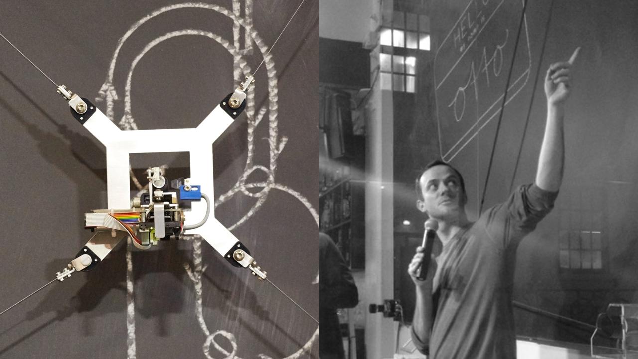 The design of the chalk-drawing machine is extremely elegant, using an unconventional system of pulleys that is driven by high-quality Maxon Swiss servo motors to triangulate the drawing tool. The motors are coordinated by an open-source controller developed by Jürg himself.